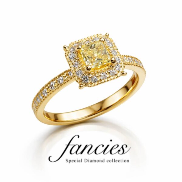ブルージュ、ファンシーイエローのダイヤモンドは見た目にも鮮やかな純色の黄色がとても美しくセッティングされています。タイプ1Bに分類される子のダイヤモンドは蛍光性もミディアムイエローの反応で、晴れた日の太陽光線下では”カナリアンイエロー”の鮮烈な見た目となります。