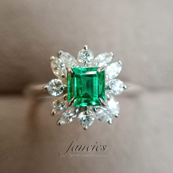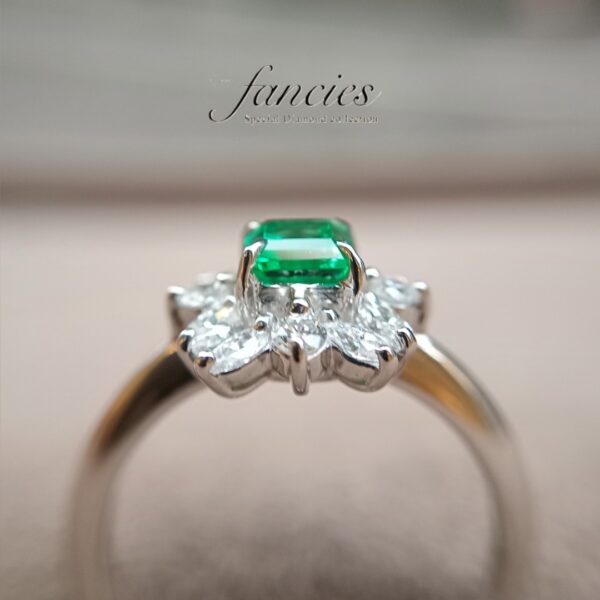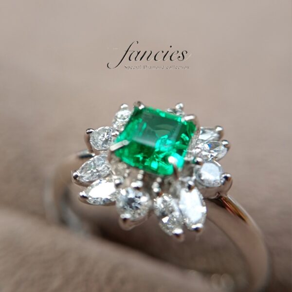 周囲を囲むダイヤモンドとのコントラストも絶妙で、中央のエメラルドがまるで光の花の中心に咲く若葉のよう。気品と華やかさを兼ね備えたデザインは、フォーマルにも日常の特別なワンシーンにもふさわしい輝きを添えてくれます。