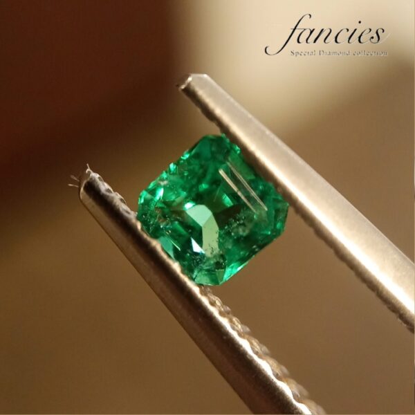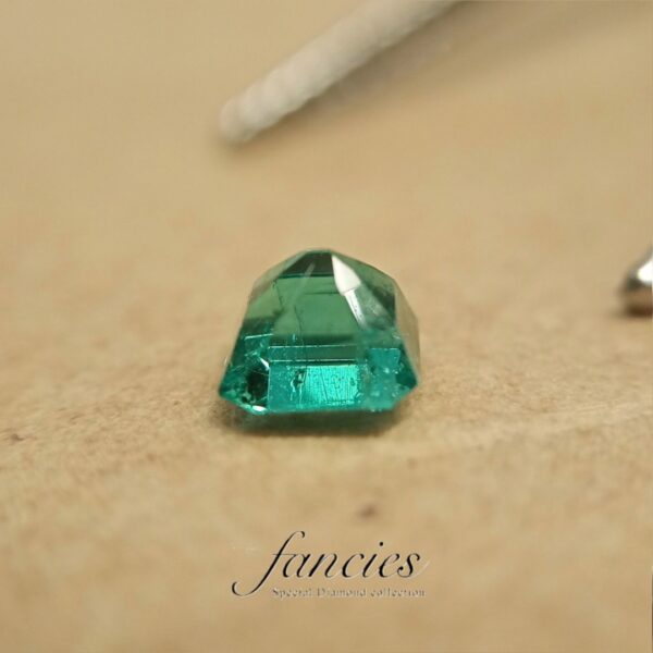 カットは端正なエメラルドカット。光の反射を抑え、色の深みを最大限に引き出す“正統派のカット”です。テーブル面から覗く緑の奥行きが見事で、ジュエリーに仕立てた際には、上品で知的な印象を与えるでしょう。
