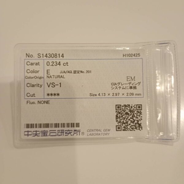 こちらは 0.234ct / Eカラー / VS1 の高品質ダイヤモンドを、エメラルドカット(EM)にて仕上げた一点ものです。