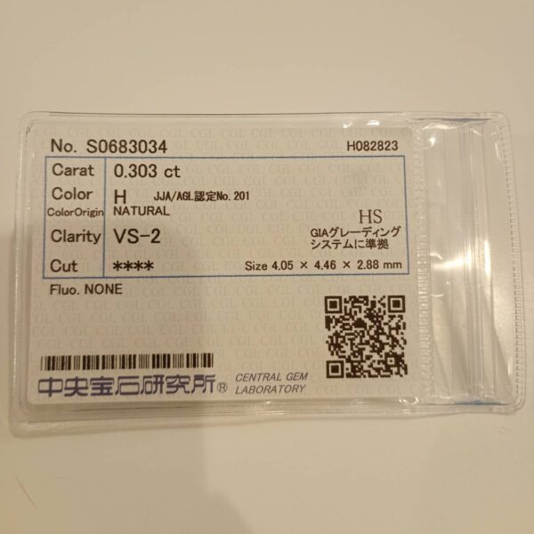 クラリティVS-2、蛍光性NONE(なし)というスペックが示す通り、お写真でも確認いただけるように、澄み切った輝きを放ちます。
